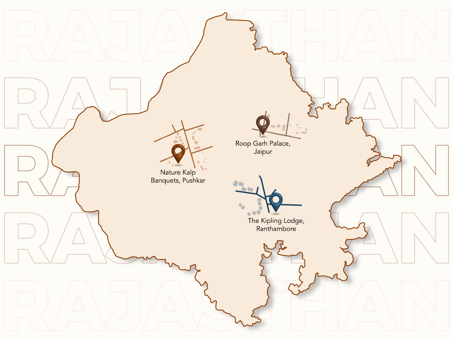 Each of our properties offers a distinct experience — from the forest charm of The Kipling Lodge in Ranthambore, to the regal elegance of Roop Garh Palace nestled in the Aravallis, and the farm-style comfort of Nature Kalp Pushkar, complete with expansive villas and the city’s most luxurious banquet.